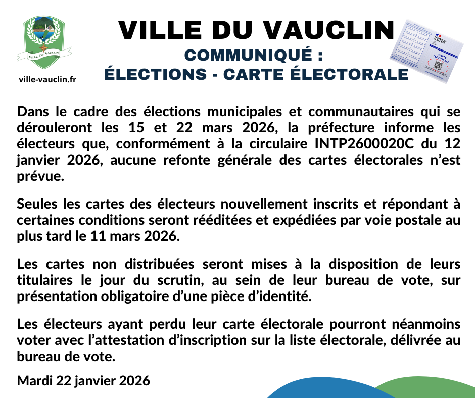Dans le cadre des élections municipales et communautaires qui se dérouleront les 15 et 22 mars 2026, la préfecture informe les électeurs que, conformément à la circulaire INTP2600020C du 12 janvier 2026, aucune refonte générale des cartes électorales n’est prévue.